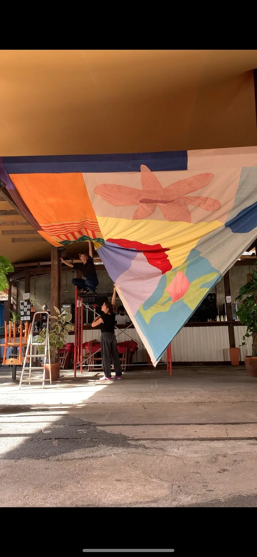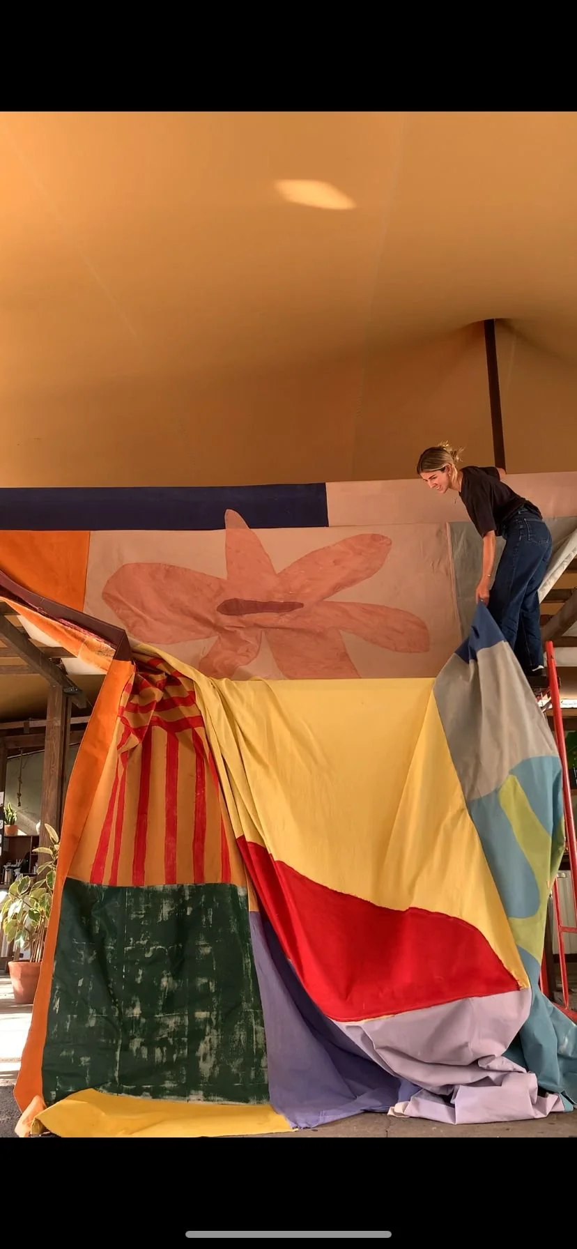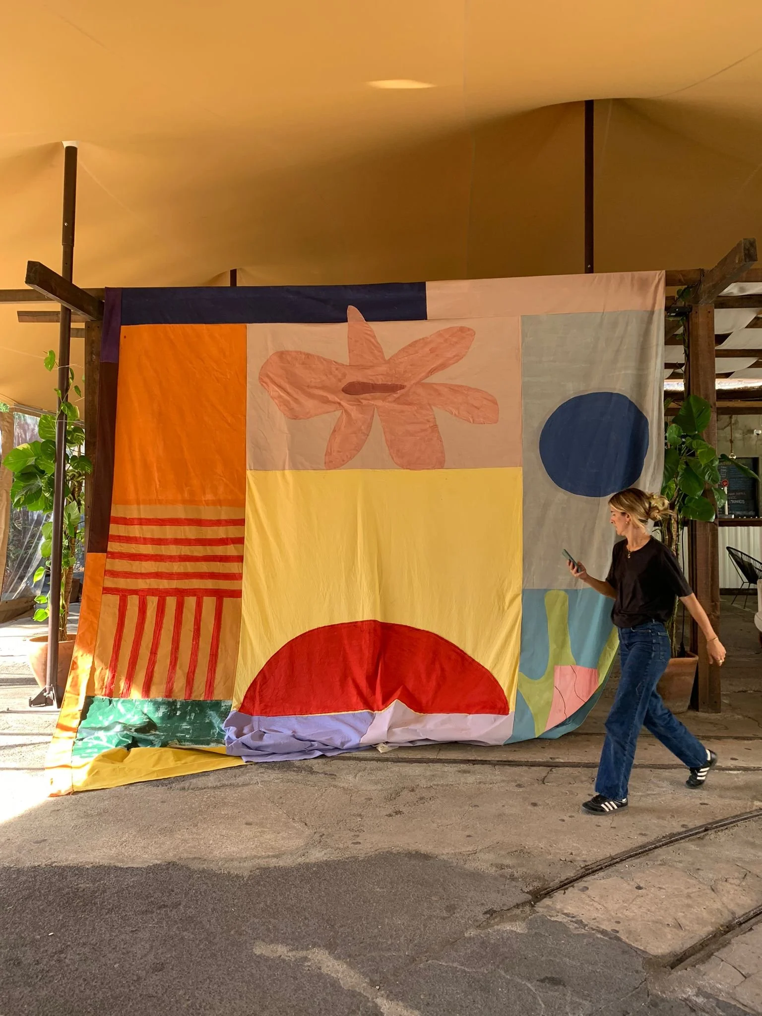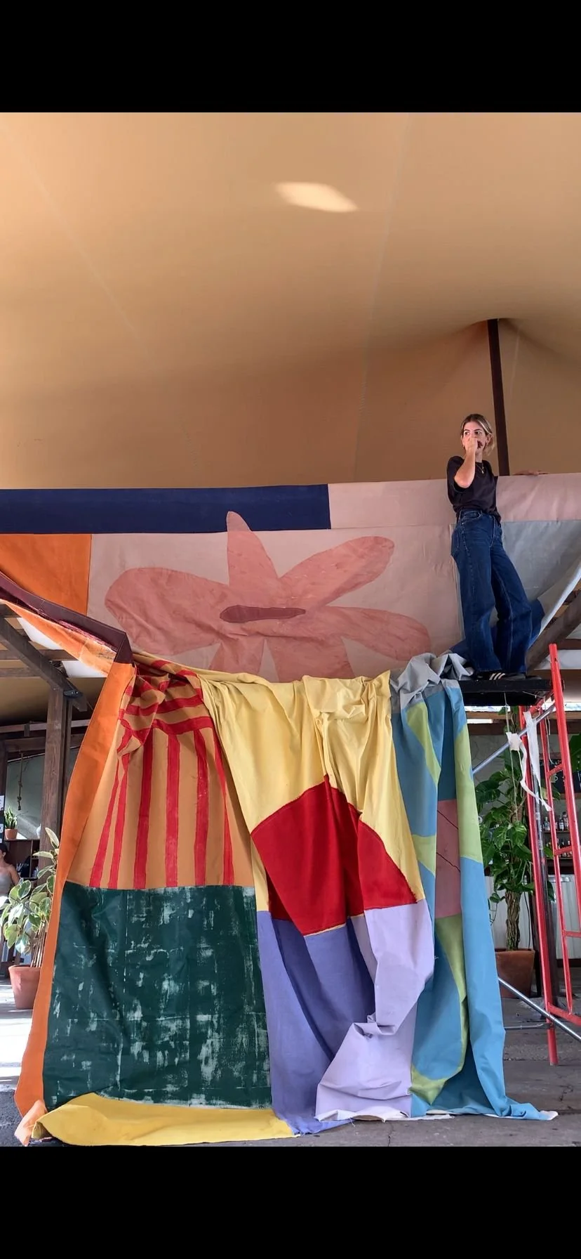 In a fusion of textile art and scenography, the installation features a large piece of fabric, hand-dyed and hand-painted, where fluid colors and organic patterns intertwine as if dancing with precision.