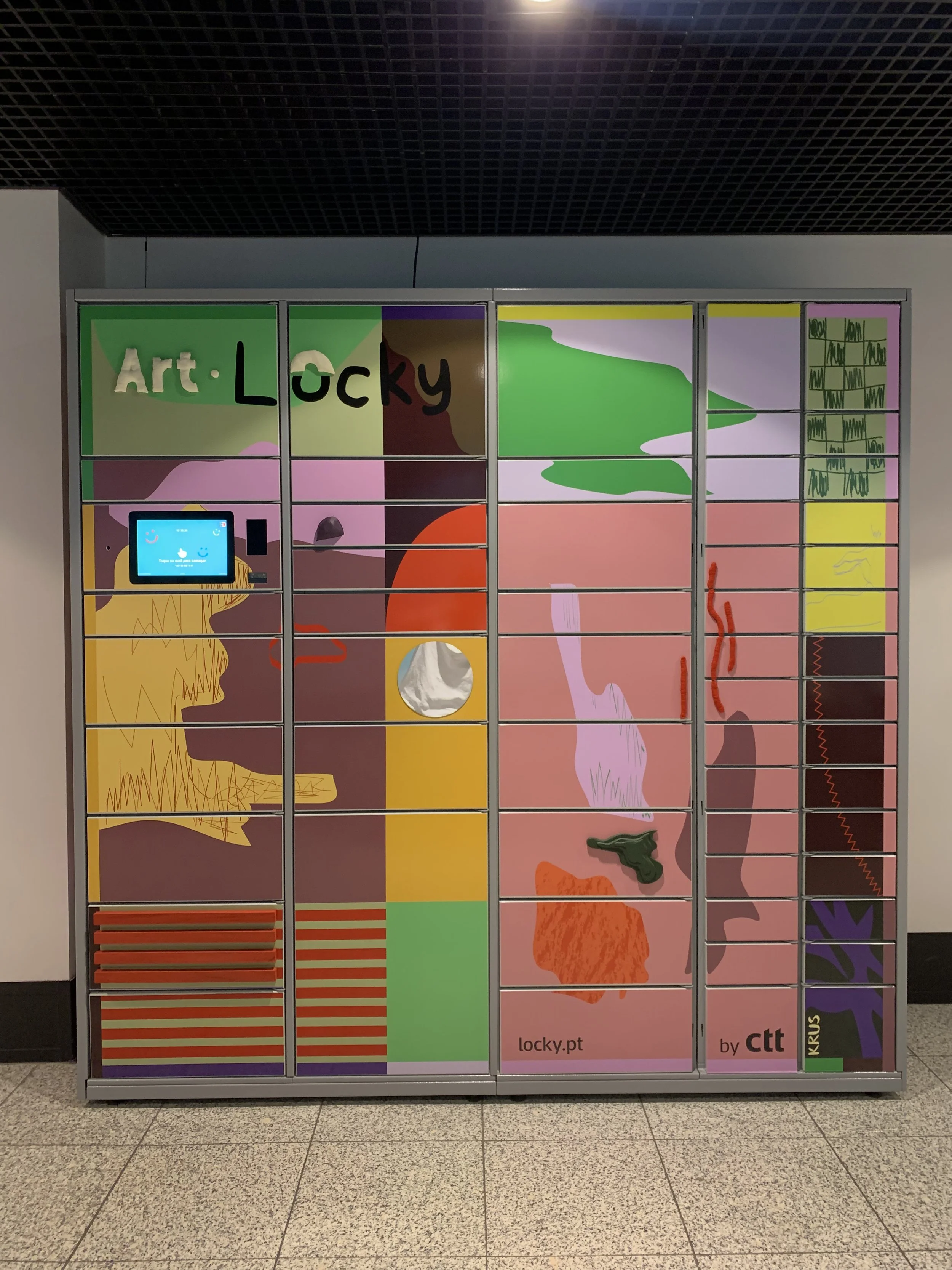 The artwork with tridimensional elements invites the user to interact and feel the piece during their experience of dropping off or picking up parcels.